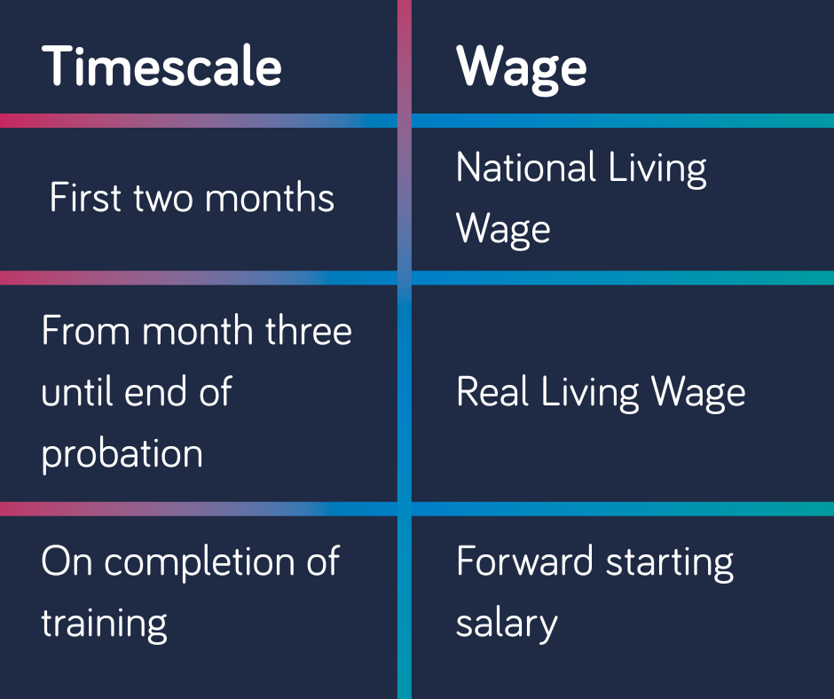 As for any employee, Trainees need to complete a probationary period of 6 months, which can be extended if the manager considers it necessary. Once Trainees have passed their probationary period and completed their training, they will be considered as a permanent member of staff, with the relevant contractual rights and salary level for the role.